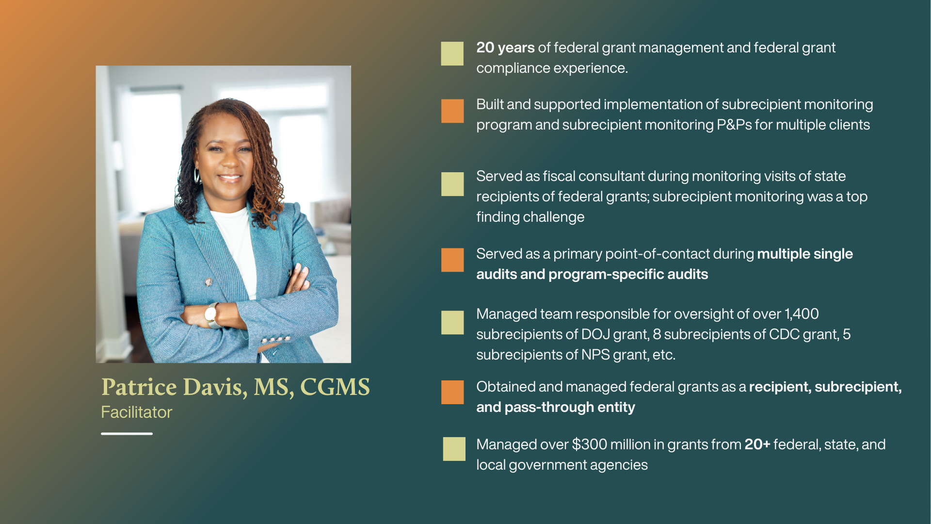 Federal grant management officers and specialists (GMOs and GMS), local and state government agency grant administrators, program leads, community college and four-year university research administrators, grant accountants, finance teams responsible for oversight of federal grants, compliance managers, nonprofit consultants, development directors, and subrecipients.